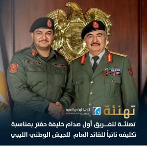 تتقدّم الإدارة التنفيذية بالجهاز الوطني للتنمية بأسمى عبارات التهاني والتبريكات إلى الفريق أوّل صدام خليفة حفتر، بمناسبة صدور قرار تكليفه نائبًا للقائد العام للقوات المسلحة العربية الليبية، متمنّين له دوام التوفيق والسداد في أداء مهامه الوطنية، ومواصلة مسيرة العطاء في خدمة الوطن، ودعم جهود بناء الجيش الوطني وحماية مقدّرات ليبيا وسيادتها.