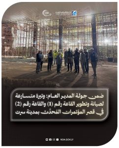 أجرى المدير العام للجهاز الوطني للتنمية، زيارة ميدانية إلى مشروع صيانة وتطوير القاعة رقم 1 والقاعة رقم 2 في قصر المؤتمرات المحدث بمدينة سرت، رفقة عدد من مديري الإدارات ومهندسي الجهاز والمكتب الاستشاري ، وذلك للوقوف على سير الأعمال ومتابعة نسب الإنجاز ووتيرة الأعمال وكفاءتها ..