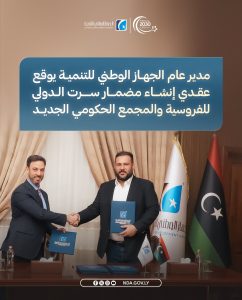 وقّع مدير عام الجهاز الوطني للتنمية، الدكتور محمود الفرجاني، عقدين لتنفيذ مشروعين استراتيجيين في مدينة سرت، هما مشروع مضمار سرت الدولي للفروسية ومشروع القصر الحكومي الجديد، وذلك مع كبريات الشركات الدولية المتخصصة في تنفيذ المشاريع الكبرى. ويأتي توقيع العقدين في إطار جهود الجهاز الوطني للتنمية لدعم مسار إعادة الإعمار وتطوير البنية التحتية والمرافق الحيوية في المدينة، ضمن رؤية 2030.